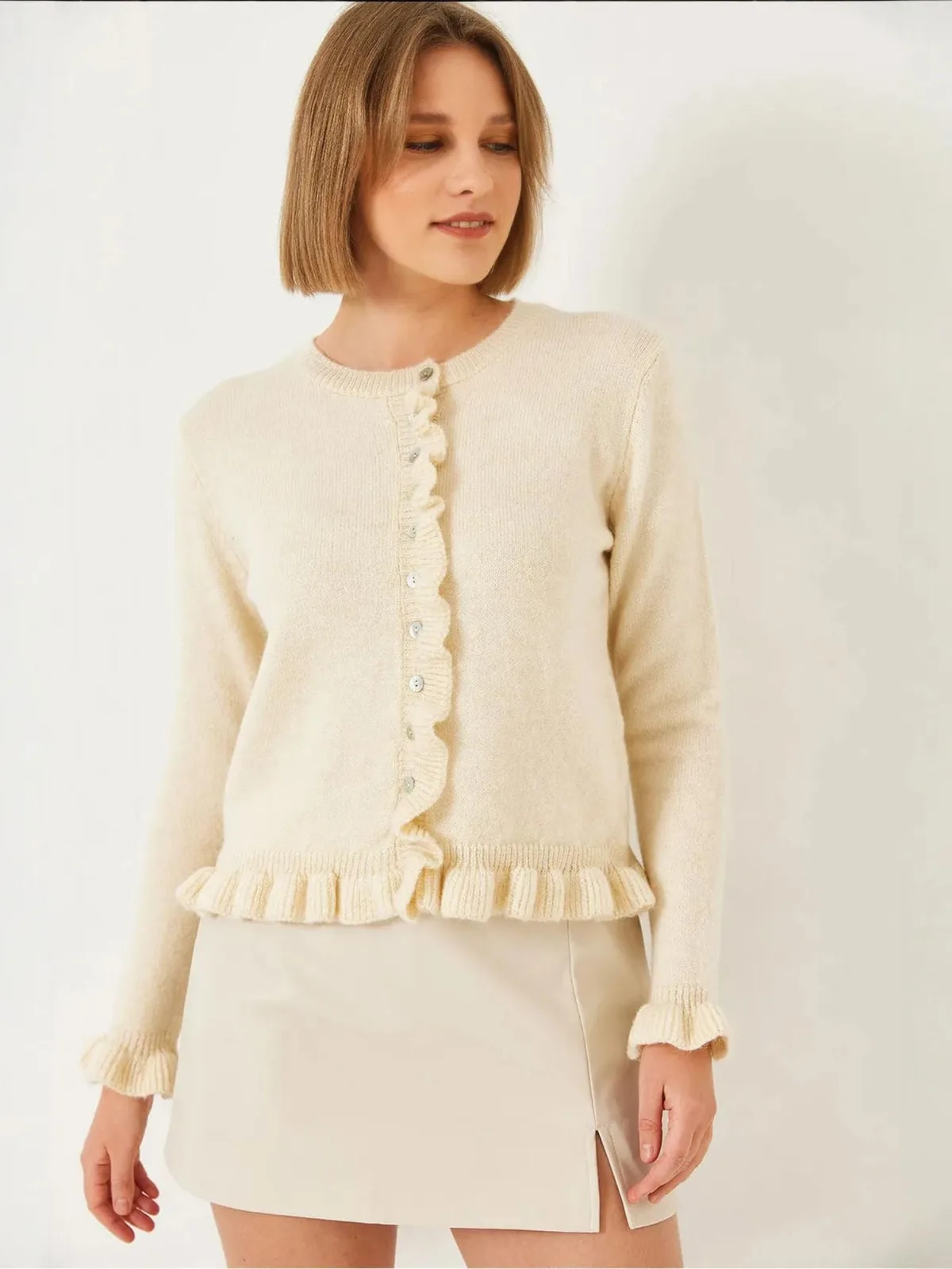 Design: Geribbelde kraag, Geribd ceintuurtje; Type sluiting: Knoopsluiting; Materiaal: Knitwear; Halstype: Ronde hals; Motief: Effen; Details: Ruches; Extra's: Met textuur, Voelt zacht aan; Pasvorm: Normale pasvorm; Armlengte: Lange mouw; Lengte: Normale lengte