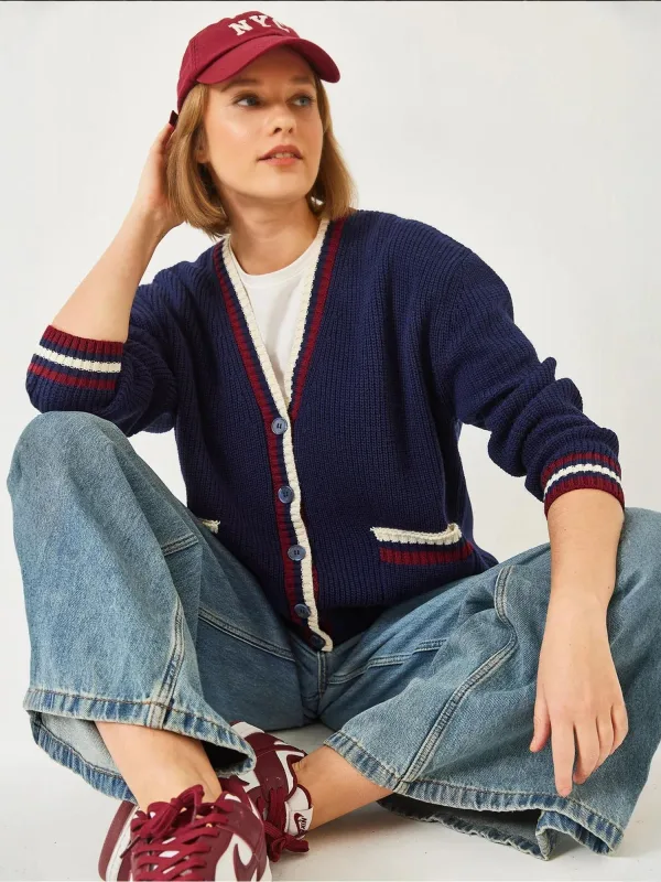 Design: Geribbelde kraag, Overcut schouder; Type sluiting: Knoopsluiting; Materiaal: Knitwear; Halstype: V-hals; Motief: Color-Blocking; Extra's: Met textuur, Voelt zacht aan; Pasvorm: Losse pasvorm; Armlengte: Lange mouw; Lengte: Normale lengte