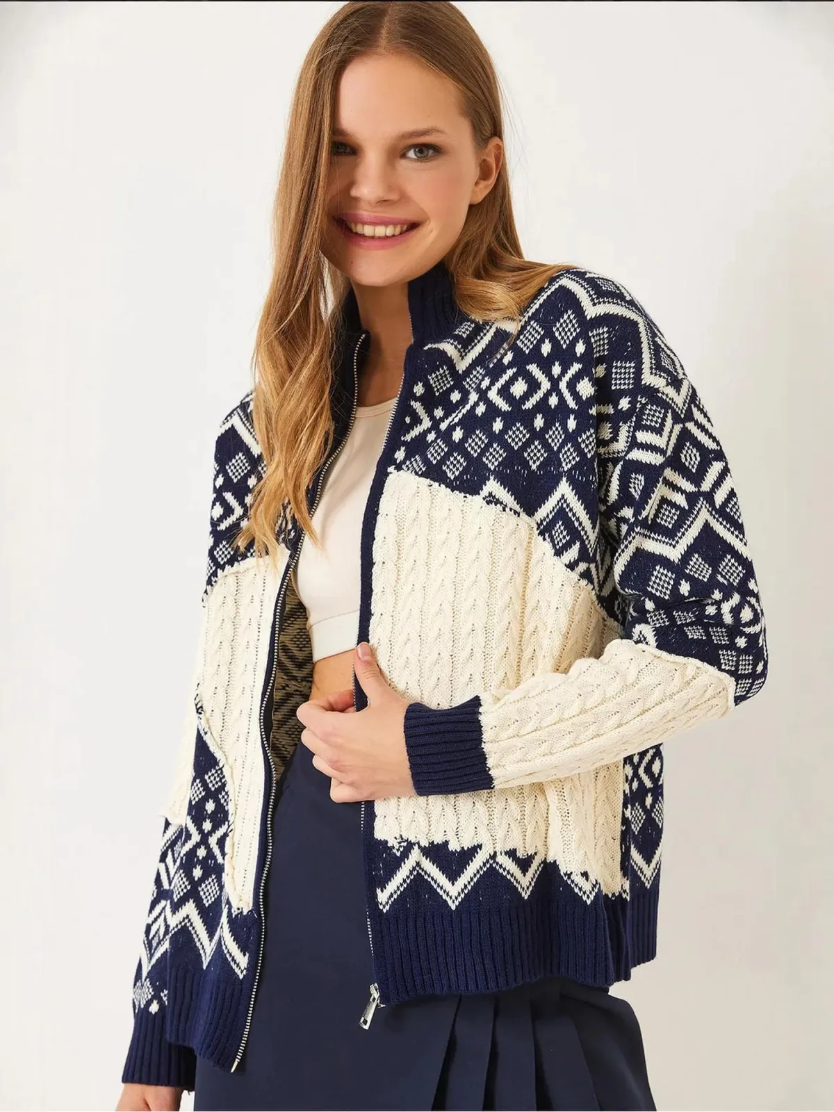 Design: Geribbelde kraag, Geribd ceintuurtje; Type sluiting: Ritssluiting; Materiaal: Knitwear; Halstype: Opstaande kraag; Motief: Aztec print; Extra's: Met textuur, Voelt zacht aan; Pasvorm: Losse pasvorm; Armlengte: Lange mouw; Lengte: Normale lengte