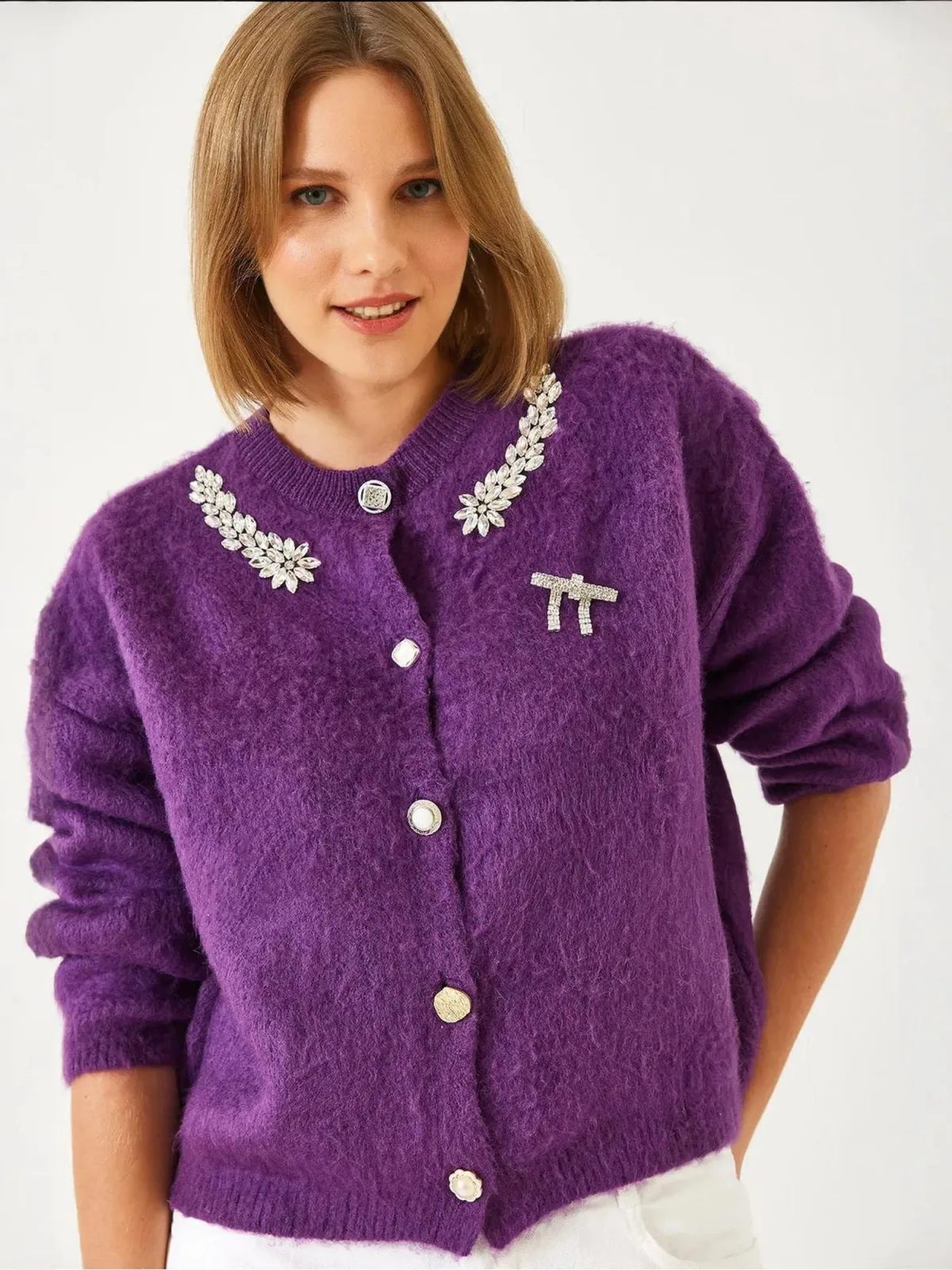 Design: Geribbelde kraag, Overcut schouder; Type sluiting: Knoopsluiting; Materiaal: Knitwear; Halstype: Ronde hals; Details: Sierstenen; Extra's: Applicaties, Voelt zacht aan; Pasvorm: Losse pasvorm; Armlengte: Lange mouw; Lengte: Normale lengte
