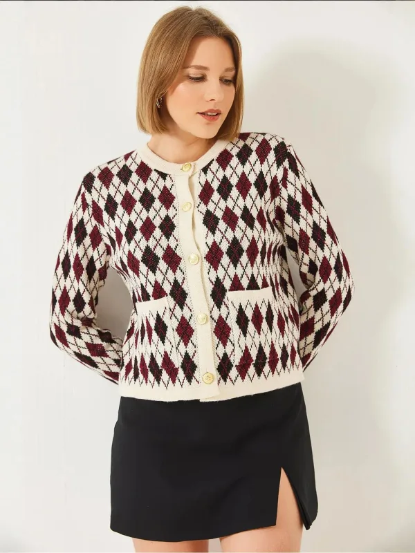 Bianco Lucci Gebreid vest ecru / chocoladebruin / bordeaux Prijzen