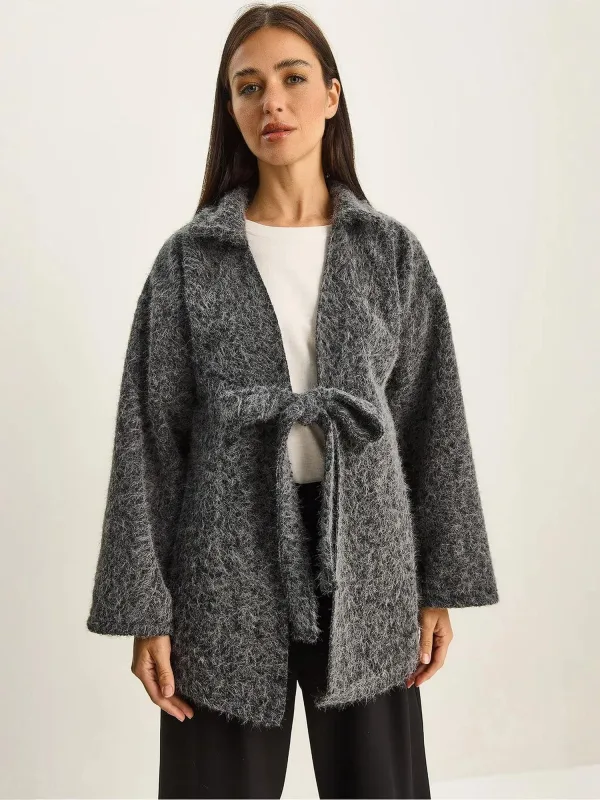 Design: Turn-down kraag, Om te knopen/binden; Materiaal: Knitwear; Motief: Mélange; Extra's: Met textuur; Pasvorm: Losse pasvorm; Armlengte: Lange mouw; Lengte: Lange pasvorm