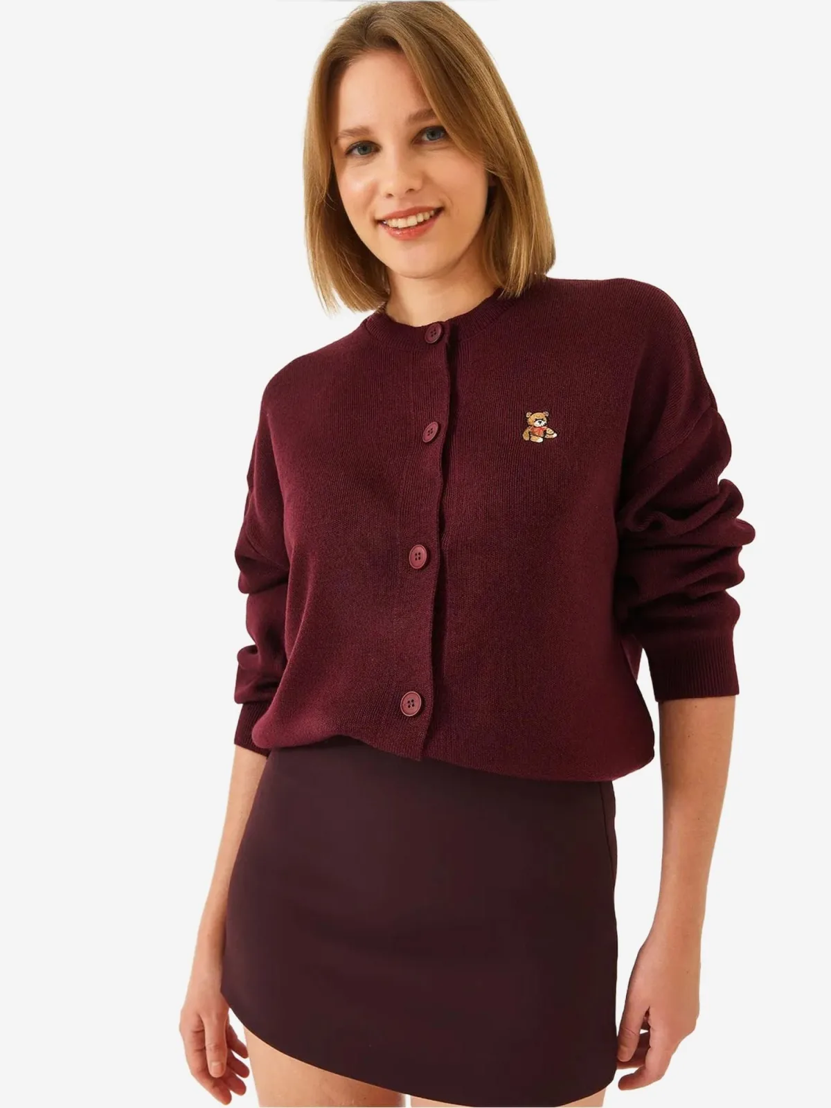 Design: Geribd ceintuurtje, Overcut schouder; Type sluiting: Knoopsluiting; Materiaal: Knitwear; Halstype: Ronde hals; Motief: Effen; Details: Borduursels; Extra's: Applicaties; Pasvorm: Normale pasvorm; Armlengte: Lange mouw; Lengte: Normale lengte