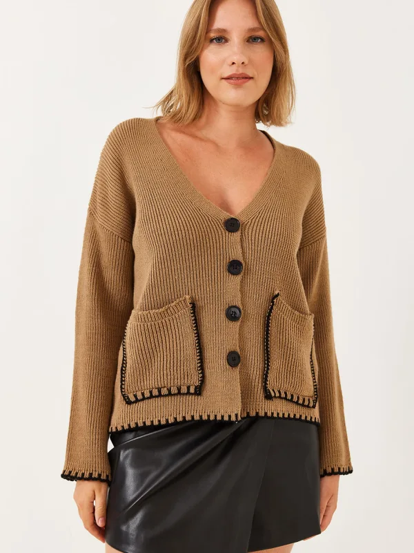 Design: Knop placket, Diepe snit/decolleté, Overcut schouder, Opgezette zakken; Type sluiting: Knoopsluiting; Materiaal: Knitwear; Halstype: V-hals; Motief: Effen; Extra's: Contrasterende naden, Met textuur, Voelt zacht aan; Pasvorm: Normale pasvorm; Armlengte: Lange mouw; Lengte: Normale lengte