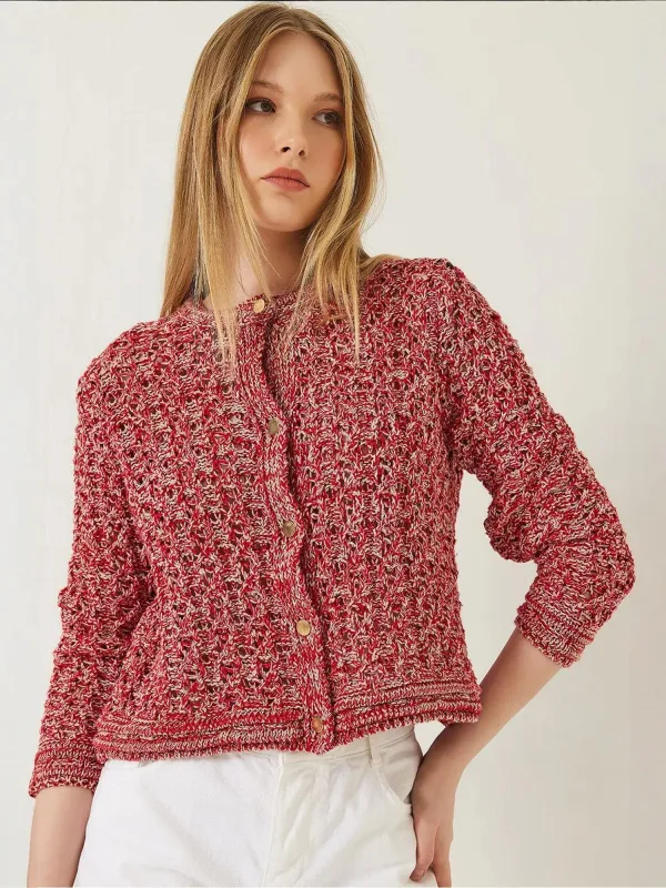 Design: Knop placket; Type sluiting: Knoopsluiting; Materiaal: Knitwear; Halstype: Ronde hals; Motief: Mélange; Details: Mesh; Extra's: Jacquard patroon, Met textuur; Pasvorm: Normale pasvorm; Armlengte: Lange mouw; Lengte: Korte pasvorm