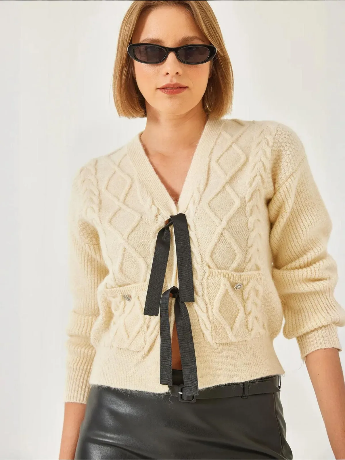 Design: Overcut schouder, Vlecht brei; Materiaal: Knitwear; Halstype: V-hals; Motief: Effen; Details: Sierstenen; Extra's: Met textuur; Pasvorm: Normale pasvorm; Armlengte: Lange mouw; Lengte: Normale lengte