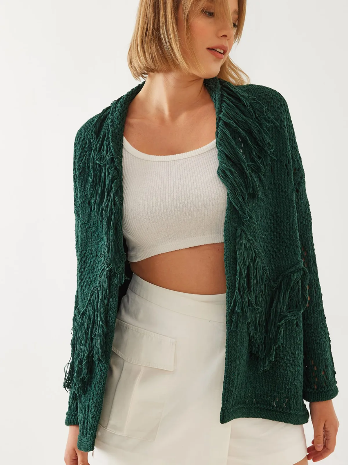 Design: Overcut schouder, Zonder sluiting; Materiaal: Knitwear; Motief: Effen; Details: Franjes, Mesh; Extra's: Fully fashioned, Met textuur; Pasvorm: Losse pasvorm; Armlengte: Lange mouw; Lengte: Normale lengte
