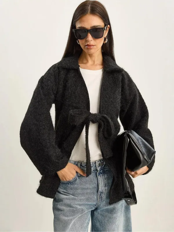 Design: Turn-down kraag, Om te knopen/binden; Materiaal: Knitwear; Motief: Mélange; Extra's: Met textuur; Pasvorm: Losse pasvorm; Armlengte: Lange mouw; Lengte: Lange pasvorm