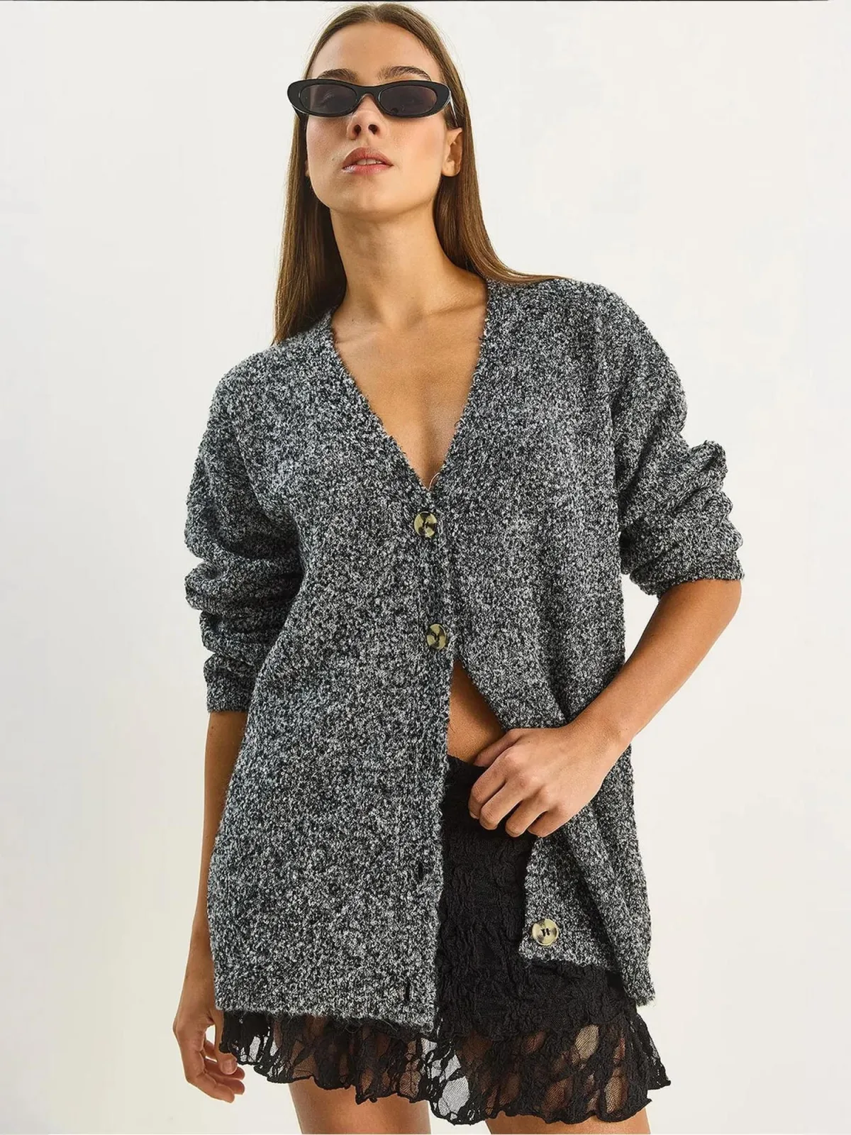 Design: Geribd ceintuurtje, Overcut schouder; Type sluiting: Knoopsluiting; Materiaal: Knitwear; Halstype: V-hals; Motief: Mélange; Extra's: Fully fashioned, Met textuur; Pasvorm: Losse pasvorm; Armlengte: Lange mouw; Lengte: Lange pasvorm