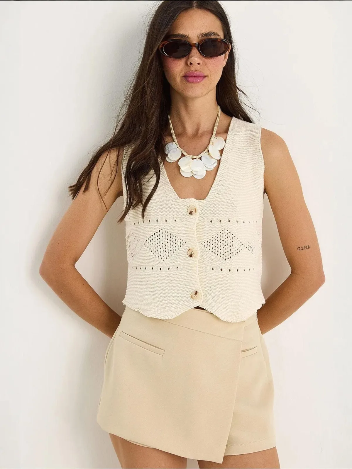 Design: Knop placket, Diepe snit/decolleté; Type sluiting: Knoopsluiting; Materiaal: Knitwear; Halstype: V-hals; Motief: Effen; Details: Mesh; Extra's: Voelt zacht aan; Pasvorm: Normale pasvorm; Armlengte: Mouwloos; Lengte: Normale lengte