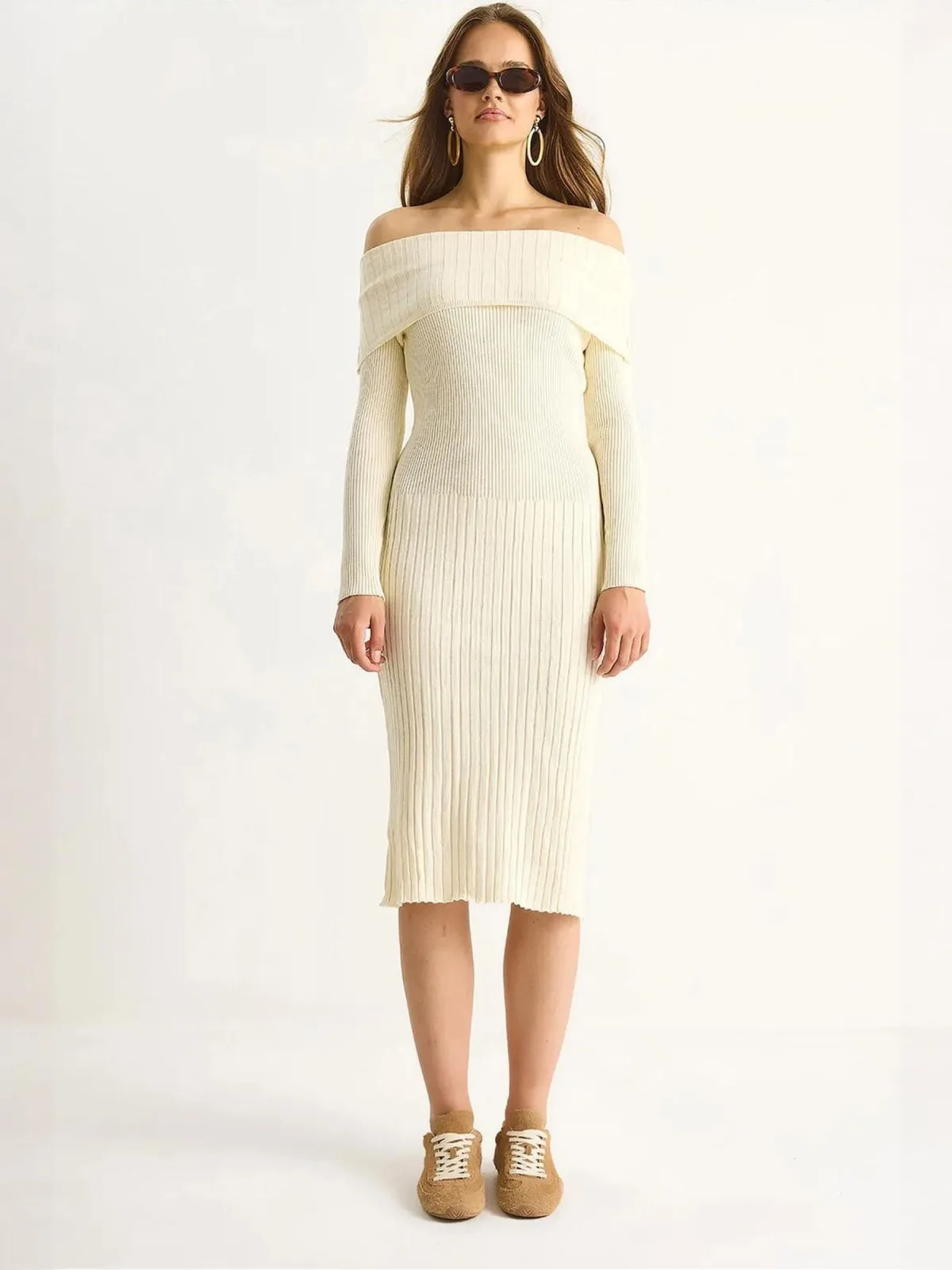 Design: Strapless/off-shoulder; Materiaal: Knitwear; Halstype: Carmen hals; Motief: Effen; Extra's: Met textuur; Lengte: 3/4 lengte; Snit: Figuur omarmend; Pasvorm: Slanke pasvorm; Armlengte: Lange mouw