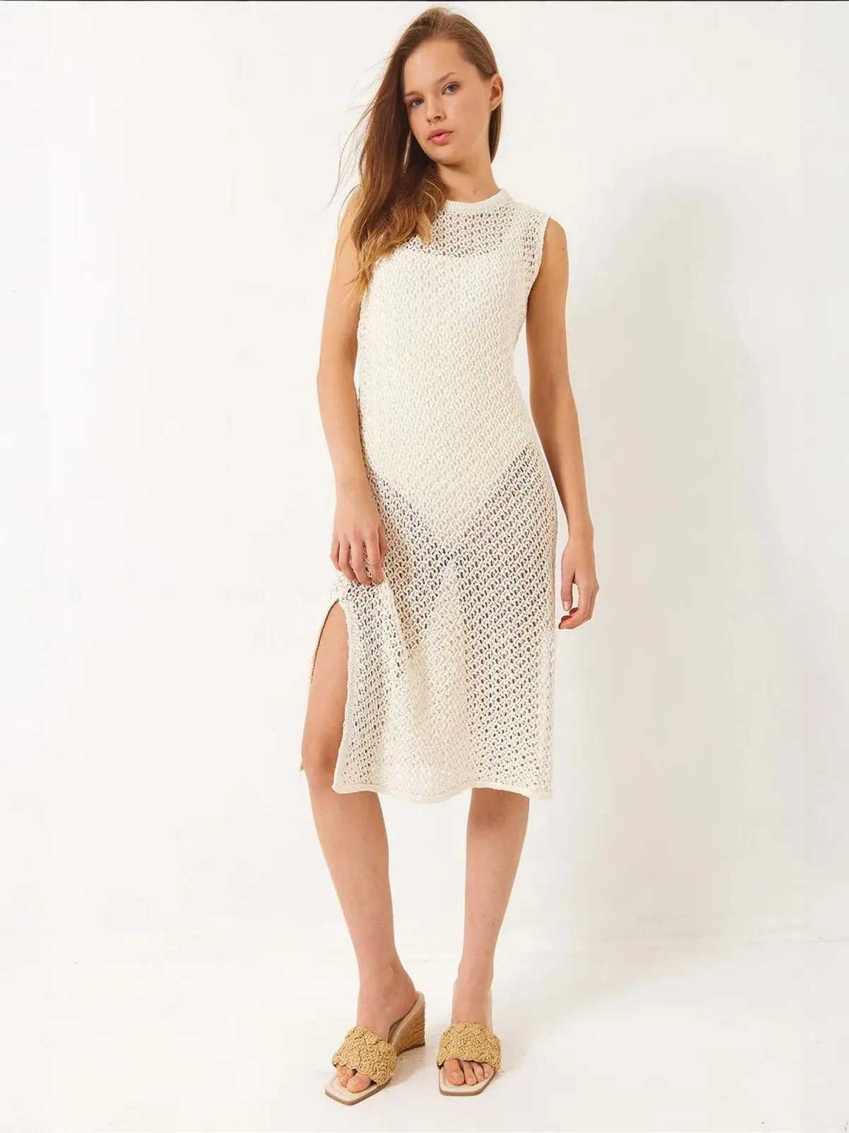 Design: Geribbelde kraag, Rechte zoom; Materiaal: Gehaakt; Halstype: Ronde hals; Motief: Effen; Soort bandjes: Brede bandjes; Details: Mesh; Extra's: Licht transparant, Met textuur; Lengte: Knielengte; Snit: Recht; Pasvorm: Slanke pasvorm; Armlengte: Mouwloos
