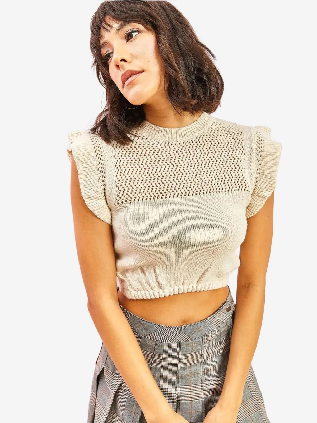 Design: Geribbelde kraag, Elastische taille/zoom; Materiaal: Knitwear; Motief: Effen; Details: Ruches, Mesh; Extra's: Met textuur; Pasvorm: Slanke pasvorm
