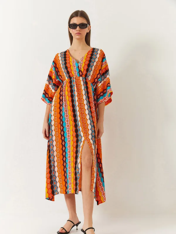 Specificaties: Bianco Lucci Jurk aqua / goudgeel / oranje / zwart