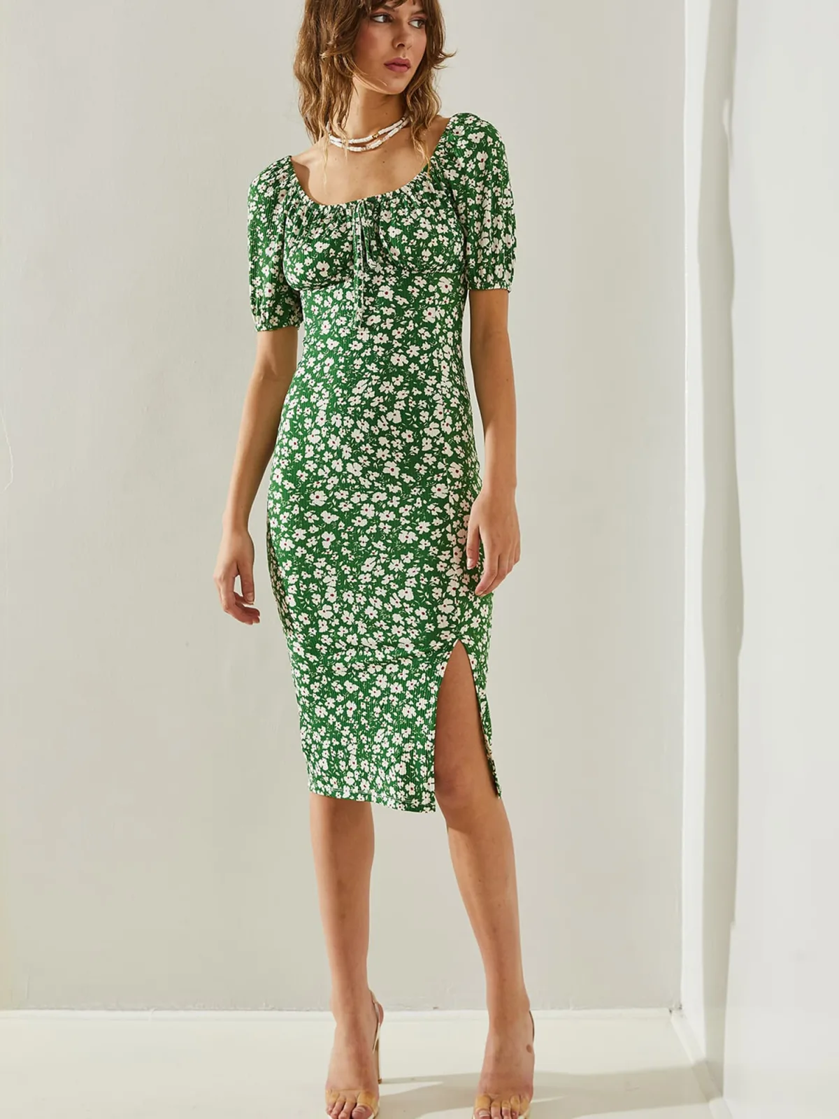 Design: Beenopening, Om te knopen/binden; Halstype: Ronde hals; Motief: Bloemenprint; Details: Gedrapeerd; Extra's: All-over patroon, Gladde stof; Lengte: Knielengte; Snit: Figuur omarmend; Pasvorm: Aansluitende pasvorm; Armlengte: Kwartmouw