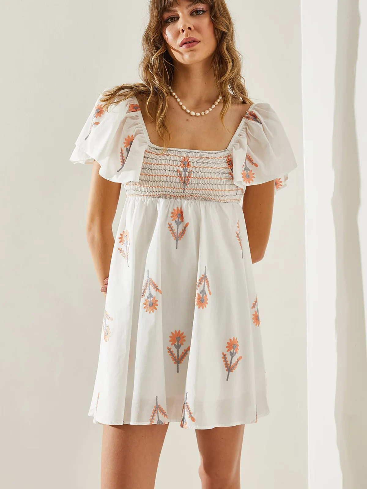 Design: Gevoerde zoom/rand, Pofmouwen, Om te knopen/binden, Elastische inzetstukken, Uitgesneden rug; Materiaal: Katoen; Halstype: Carréhals; Motief: Bloemenprint; Details: Borduursels, Gedrapeerd, Backless; Extra's: All-over patroon, Voelt zacht aan; Lengte: Kort/mini; Snit: Uitlopend; Pasvorm: Normale pasvorm; Armlengte: Kwartmouw