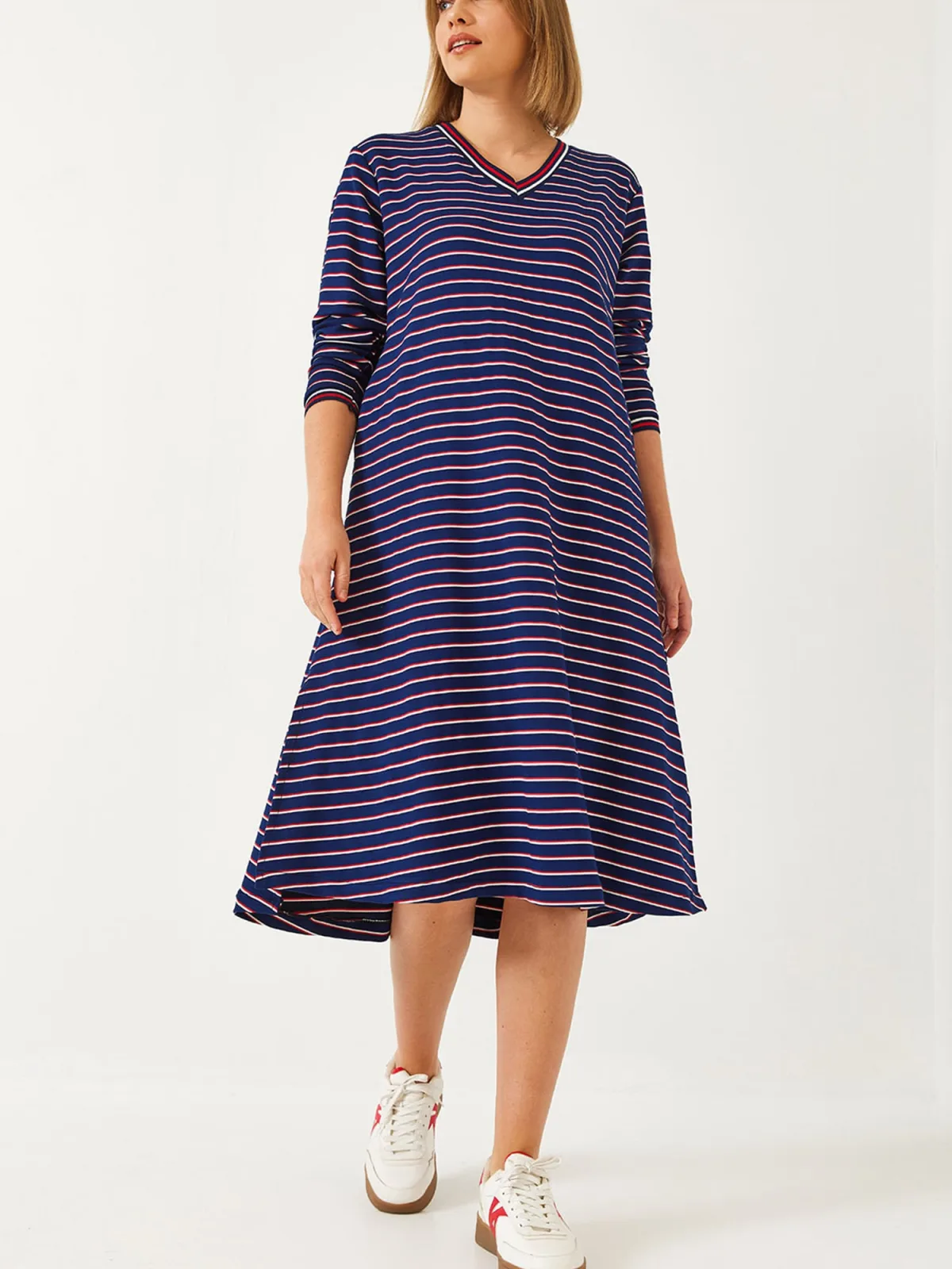 Design: Afgeronde manchetten, Geribbelde kraag; Materiaal: Jersey; Halstype: V-hals; Motief: Gestreept; Extra's: All-over patroon, Voelt zacht aan; Lengte: Knielengte; Snit: Uitlopend; Pasvorm: Losse pasvorm; Armlengte: Lange mouw