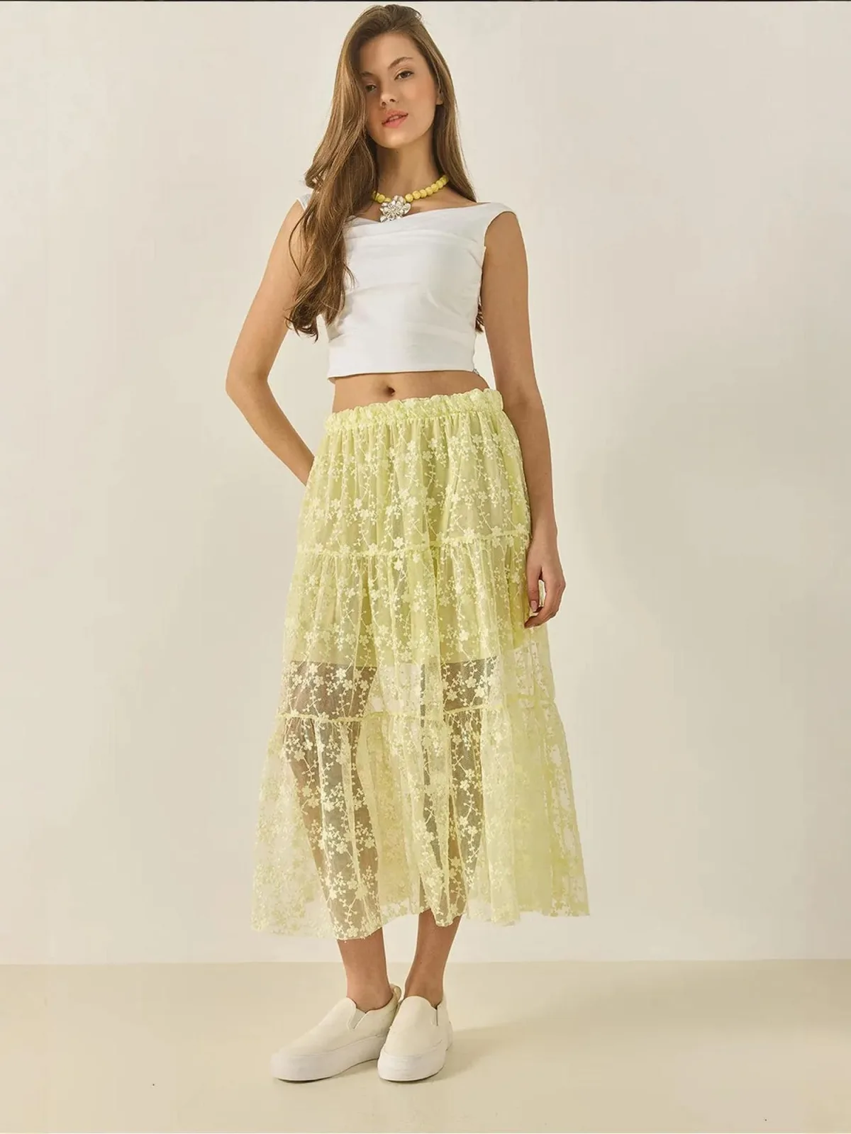 Design: Elastische taille/zoom; Materiaal: Katoen; Motief: Effen; Rokvorm: A-lijn rok; Details: Kant, Borduursels, Gedrapeerd; Extra's: Licht transparant; Lengte: 7/8 lengte; Pasvorm: Normale pasvorm