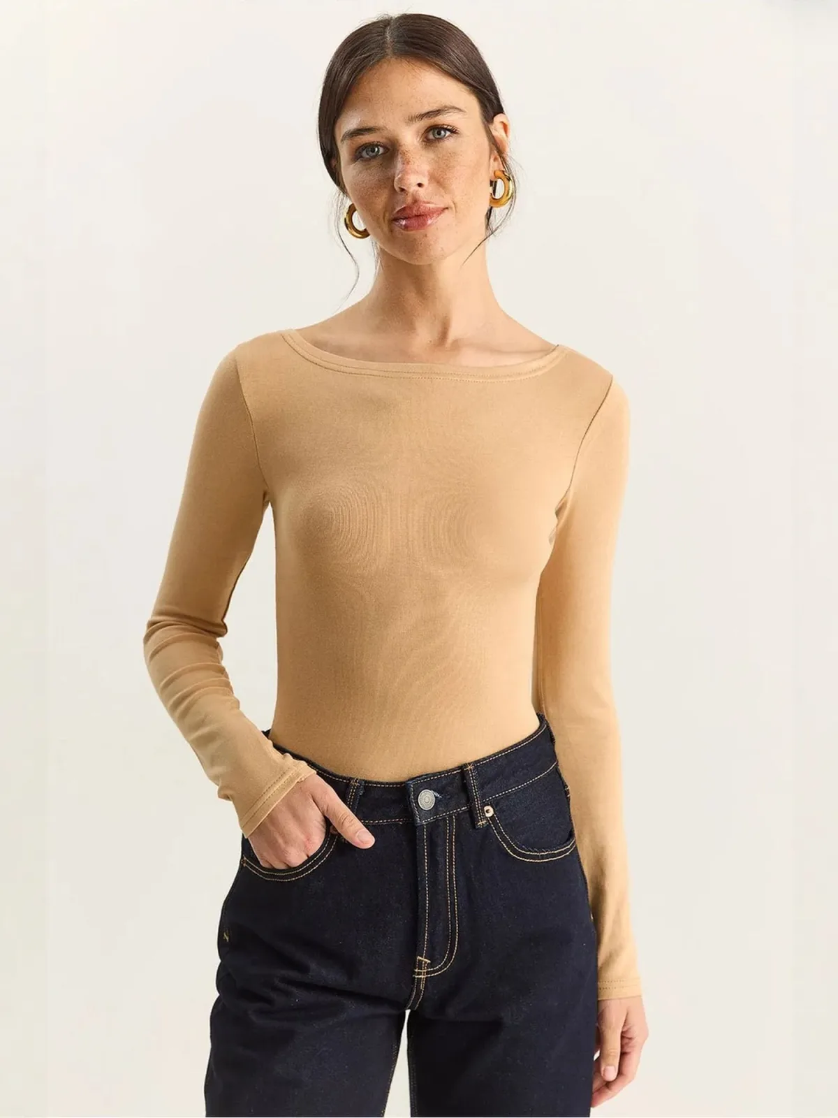 Blouse type: Blouseshirt; Design: Gevoerde zoom/rand; Materiaal: Jersey; Halstype: Boothals; Motief: Effen; Extra's: Op staal naden, Lichte stof; Pasvorm: Aansluitende pasvorm; Armlengte: Lange mouw; Lengte: Normale lengte