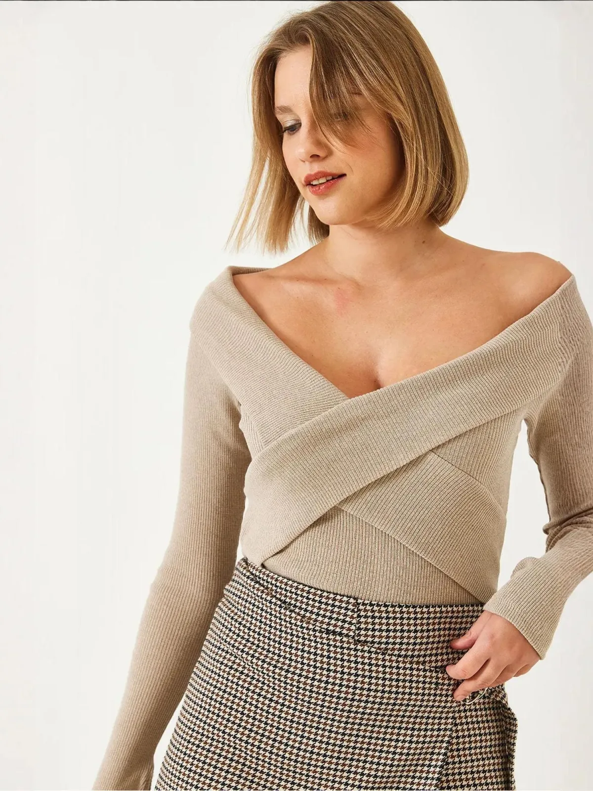 Design: Geribbeld gebreid, Wikkel-look; Materiaal: Jersey; Halstype: Carmen hals; Motief: Effen; Extra's: Op staal naden, Met textuur; Pasvorm: Slanke pasvorm; Armlengte: Lange mouw; Lengte: Normale lengte