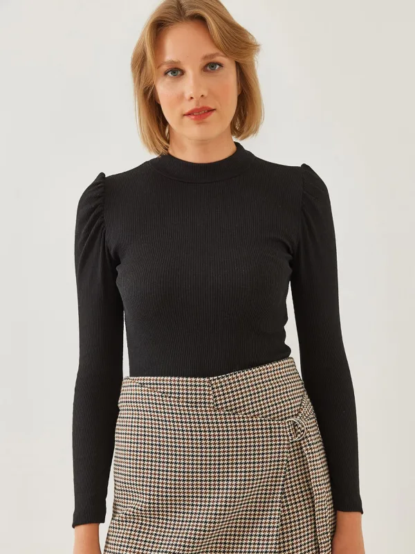 Design: Gevoerde zoom/rand, Pofmouwen, Geribbeld gebreid; Materiaal: Jersey; Halstype: Opstaande kraag; Motief: Effen; Details: Gedrapeerd; Extra's: Met textuur, Voelt zacht aan; Pasvorm: Normale pasvorm; Armlengte: Lange mouw; Lengte: Normale lengte