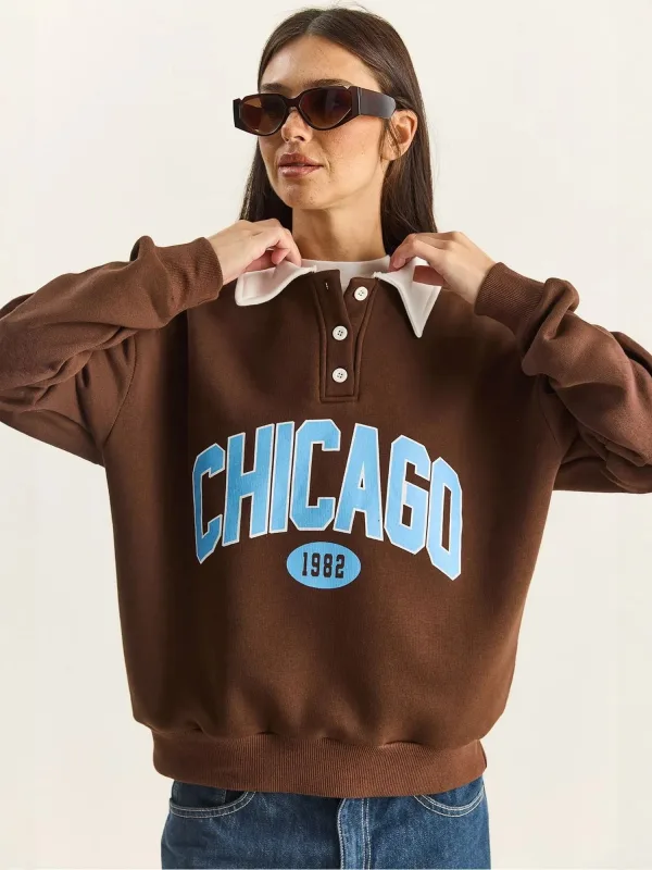 Design: Oversized, Geribd ceintuurtje; Materiaal: Sweatstof; Halstype: Polokraag; Motief: Tekst print; Pasvorm: Normale pasvorm; Armlengte: Lange mouw; Lengte: Normale lengte
