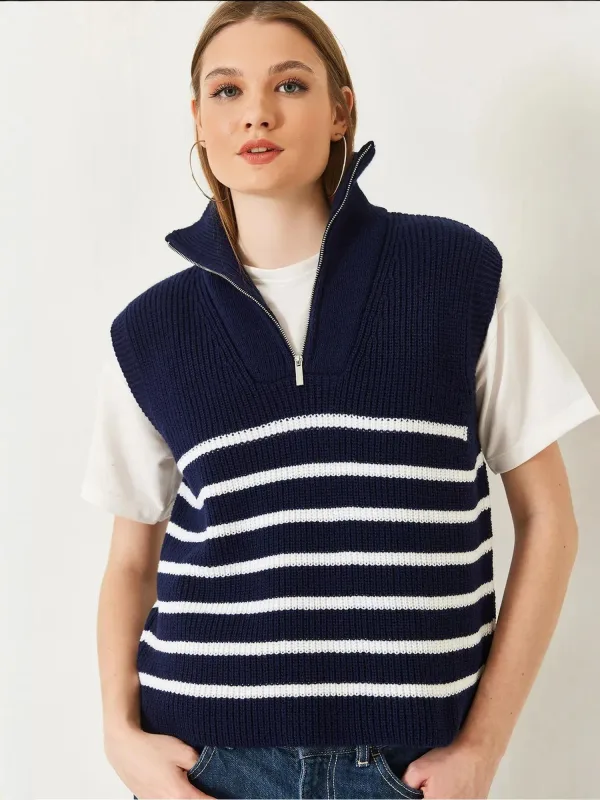Design: Geribbelde kraag, Geribd ceintuurtje, Halve rits; Type sluiting: Ritssluiting; Materiaal: Knitwear; Halstype: Schipperskraag; Motief: Gestreept; Extra's: Met textuur, Voelt zacht aan; Pasvorm: Normale pasvorm; Armlengte: Mouwloos; Lengte: Normale lengte