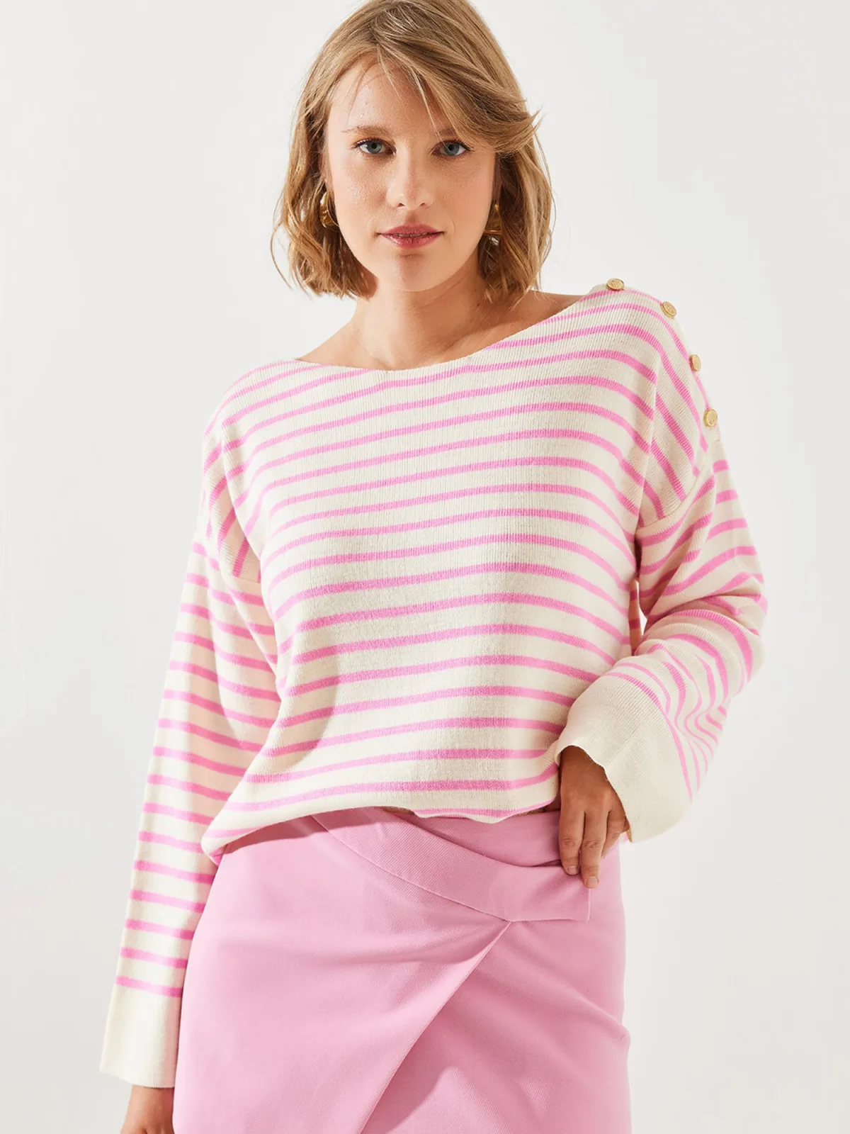 Design: Geribd ceintuurtje, Overcut schouder; Materiaal: Knitwear; Halstype: Ronde hals; Motief: Gestreept; Extra's: Applicaties, Fully fashioned, Voelt zacht aan; Pasvorm: Losse pasvorm; Armlengte: Lange mouw; Lengte: Normale lengte