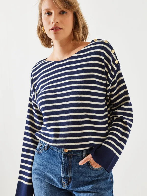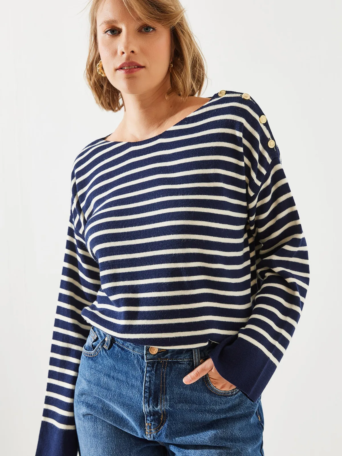 Design: Geribbelde kraag, Geribd ceintuurtje, Overcut schouder; Materiaal: Knitwear; Halstype: Ronde hals; Motief: Gestreept; Extra's: All-over patroon, Voelt zacht aan; Pasvorm: Losse pasvorm; Armlengte: Lange mouw; Lengte: Normale lengte