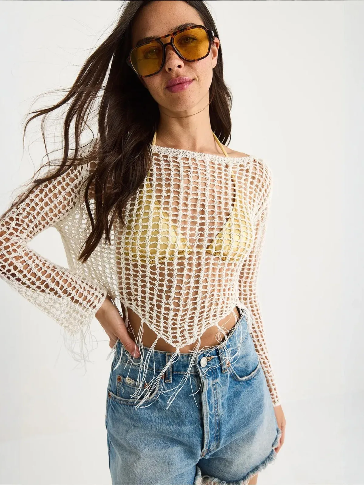 Blouse type: Blouseshirt; Design: Gefranjerde zoom, Overcut schouder; Materiaal: Gehaakt; Halstype: Boothals; Motief: Effen; Kraag: Zonder kraag; Details: Franjes, Mesh; Extra's: Visnet brei, Voelt zacht aan; Pasvorm: Losse pasvorm; Armlengte: Lange mouw; Lengte: Korte pasvorm