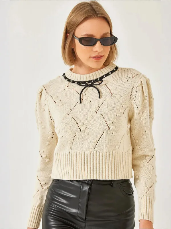 Design: Pofmouwen, Geribd ceintuurtje; Materiaal: Knitwear; Halstype: Ronde hals; Details: Sierstenen, Plooien, Mesh; Extra's: Met textuur; Pasvorm: Normale pasvorm; Armlengte: Lange mouw; Lengte: Korte pasvorm