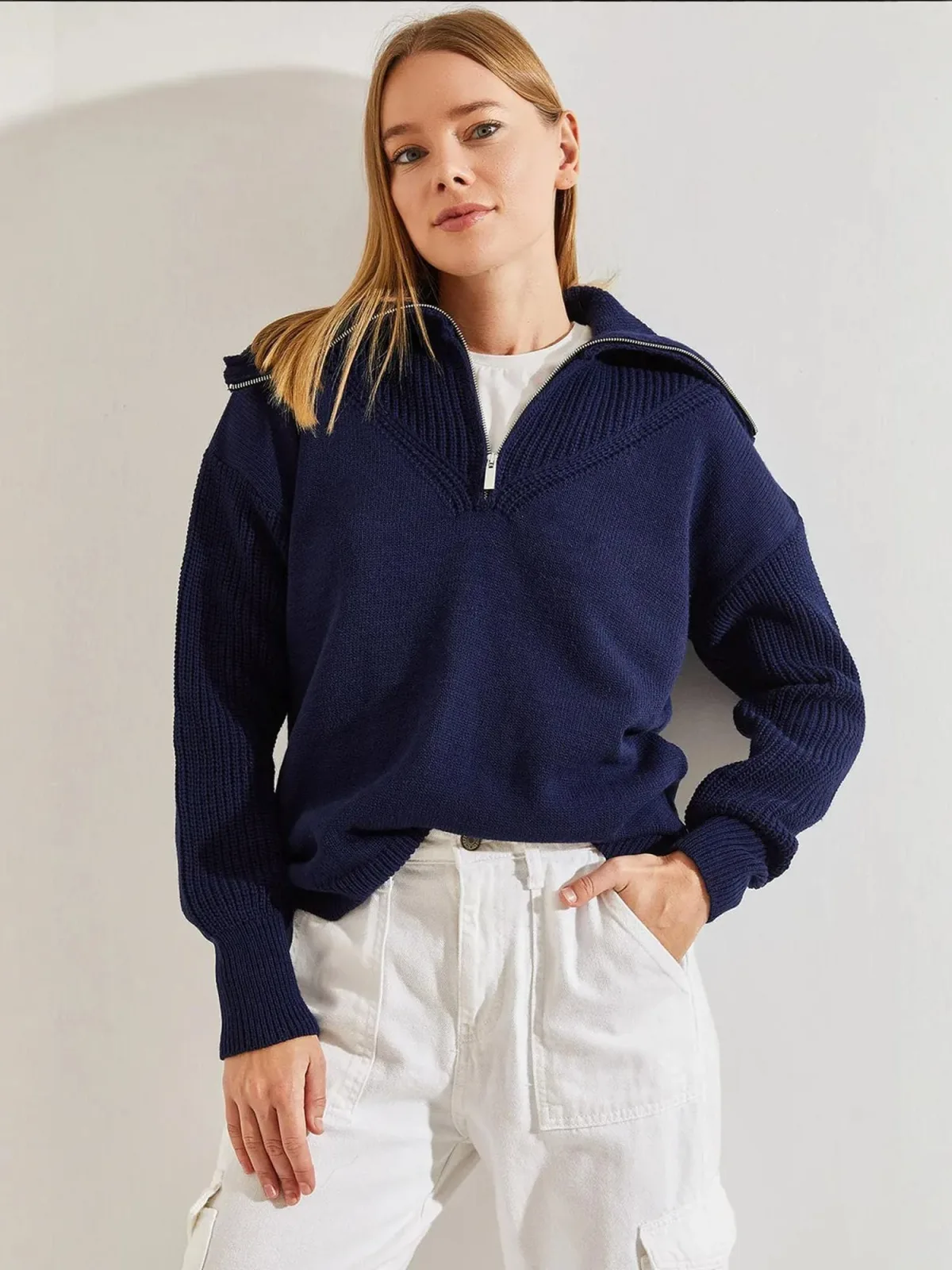 Design: Geribd ceintuurtje, Overcut schouder, Halve rits; Type sluiting: Ritssluiting; Materiaal: Knitwear; Halstype: Schipperskraag; Motief: Effen; Extra's: Voelt zacht aan; Pasvorm: Losse pasvorm; Armlengte: Lange mouw; Lengte: Normale lengte