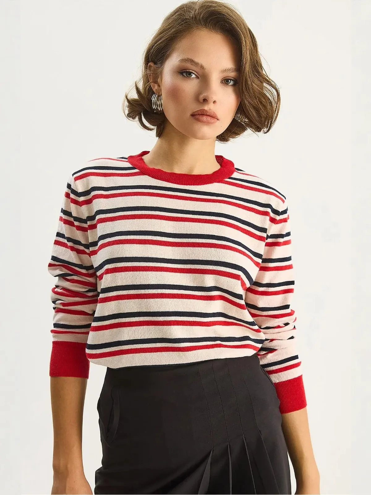 Design: Geribd ceintuurtje; Materiaal: Knitwear; Halstype: Ronde hals; Motief: Gestreept; Extra's: All-over patroon; Pasvorm: Normale pasvorm; Armlengte: Lange mouw; Lengte: Normale lengte