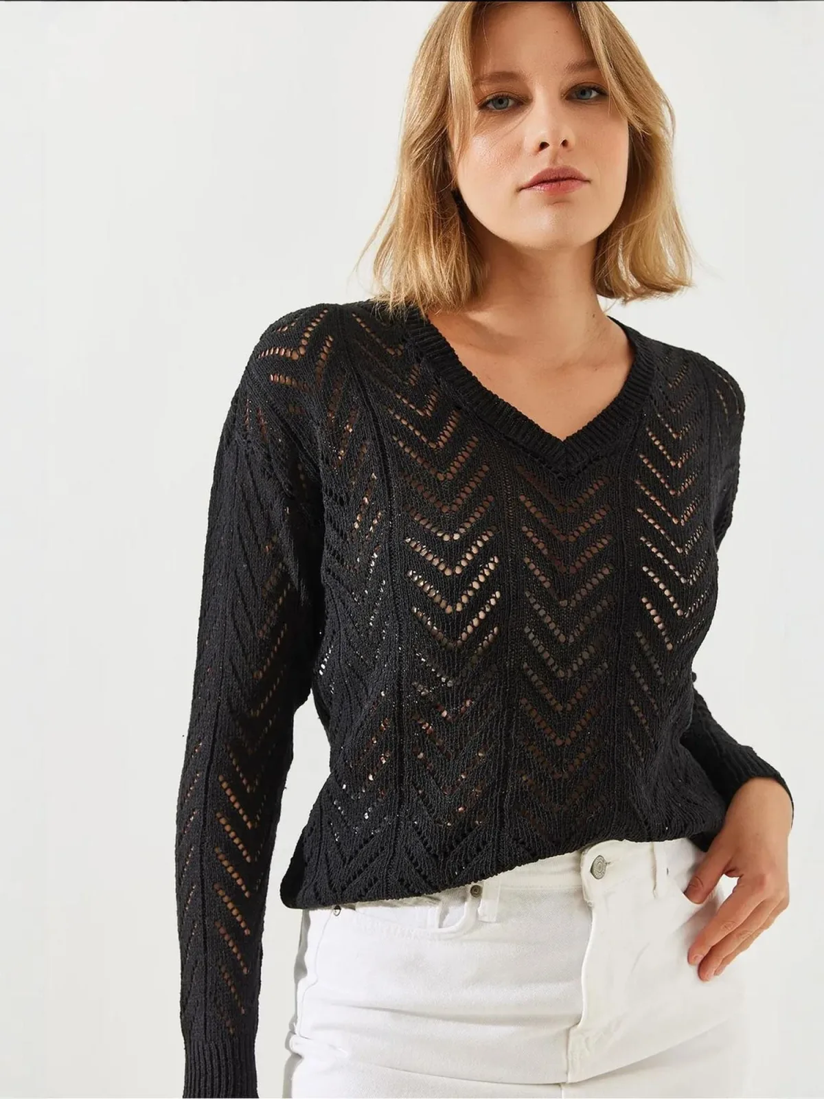 Design: Geribbelde kraag, Overcut schouder; Materiaal: Knitwear; Halstype: V-hals; Motief: Effen; Details: Mesh; Extra's: Licht transparant, Met textuur; Pasvorm: Losse pasvorm; Armlengte: Lange mouw; Lengte: Normale lengte