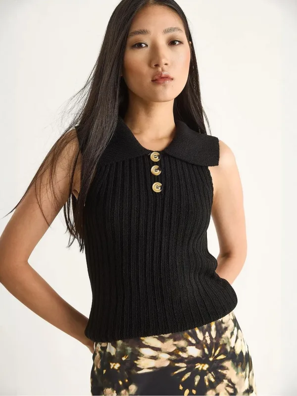 Design: Geribbelde kraag; Type sluiting: Knoopsluiting; Materiaal: Knitwear; Halstype: Polokraag; Motief: Effen; Extra's: Fully fashioned; Pasvorm: Slanke pasvorm; Armlengte: Mouwloos; Lengte: Korte pasvorm
