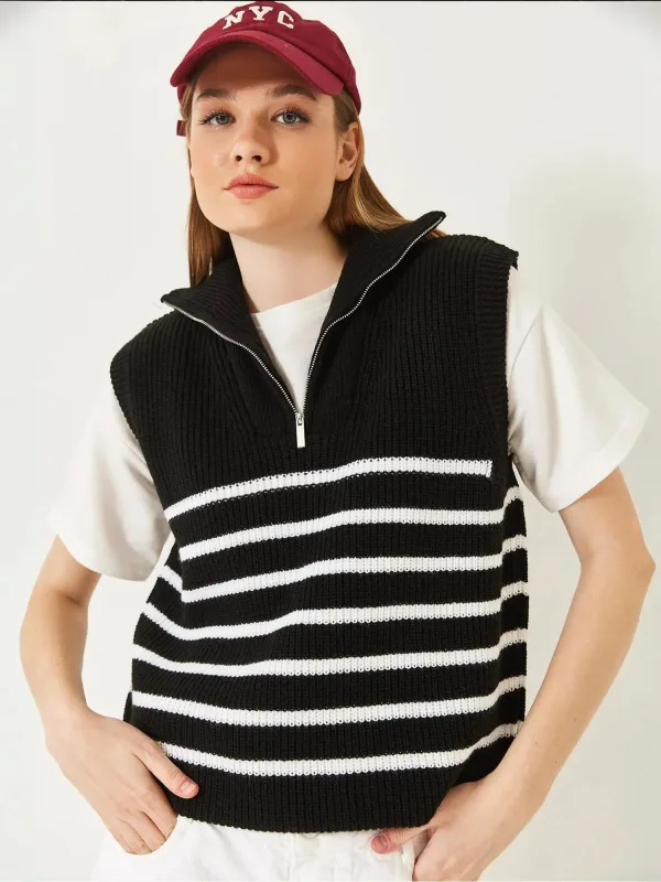 Design: Geribbelde kraag, Halve rits; Type sluiting: Ritssluiting; Materiaal: Knitwear; Halstype: Schipperskraag; Motief: Gestreept; Extra's: Met textuur, Voelt zacht aan; Pasvorm: Normale pasvorm; Armlengte: Mouwloos; Lengte: Normale lengte