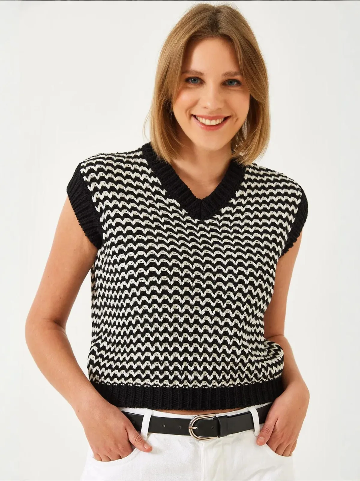 Design: Geribbelde kraag, Rechte zoom; Materiaal: Knitwear; Halstype: V-hals; Extra's: Met textuur, Voelt zacht aan; Pasvorm: Normale pasvorm; Armlengte: Mouwloos; Lengte: Normale lengte
