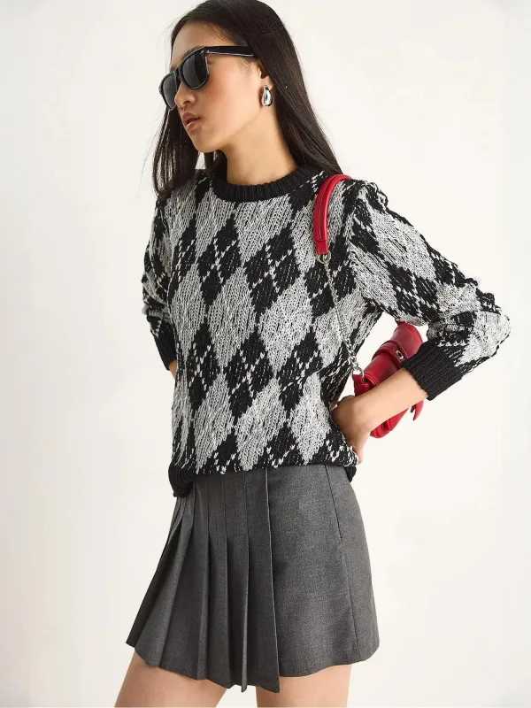 Design: Geribbelde kraag, Geribd ceintuurtje; Materiaal: Knitwear; Halstype: Ronde hals; Motief: Geruit; Extra's: Met textuur, Voelt zacht aan; Pasvorm: Normale pasvorm; Armlengte: Lange mouw; Lengte: Normale lengte