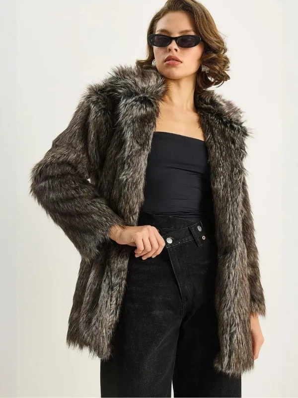 Design: Revers kraag; Type sluiting: Drukknoop; Voering: Warm gevoerd; Materiaal: Nepbont; Motief: Mélange; Extra's: Met textuur; Pasvorm: Normale pasvorm; Lengte: Korte pasvorm