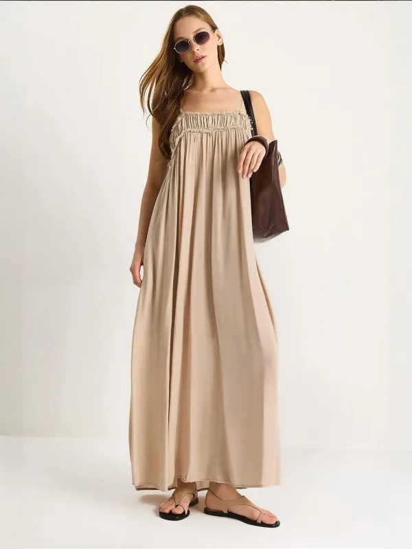 Design: Gevoerde zoom/rand, Gefranjerde zoom, Zoom/rand met boord, Zakken aan de zijkant; Halstype: Carréhals; Motief: Effen; Soort bandjes: Spaghettibandjes; Details: Ruches, Gedrapeerd; Extra's: Lichte stof, Voelt zacht aan; Lengte: Lang/maxi; Snit: Uitlopend; Pasvorm: Wijde pasvorm; Armlengte: Mouwloos