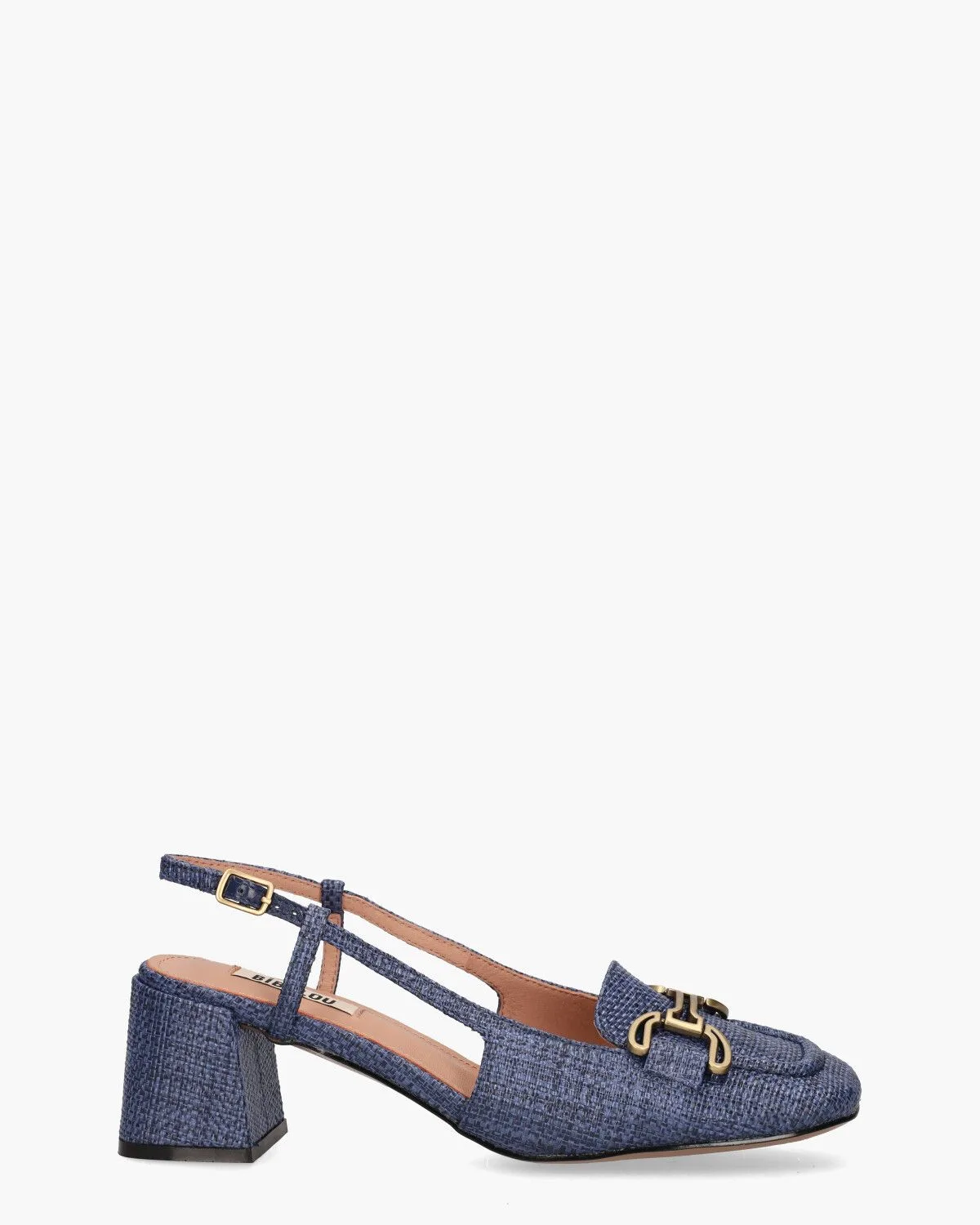Pumps voor dames Renee 544Z69VK uit de collectie van het Spaanse merk Bibi Lou. Dit retro carré-model heeft een upper van geweven stof met een blauw/zwart patroontje. De binnenkant is in glad leer uitgevoerd en voorzien van een lederen voetbed. De matgouden chain op de wreef maakt de shoes extra retro. De blokhak