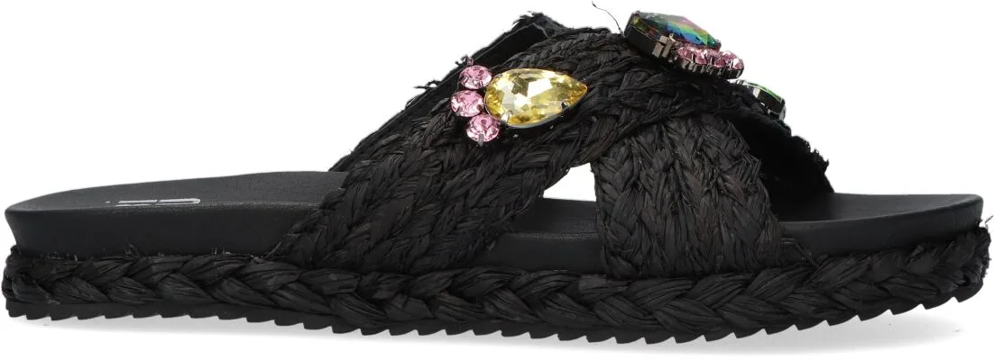 Het Spaanse merk BiBi Lou heeft een toffe collectie van trendy schoenen met een eigenwijze, vrouwelijke en krachtige uitstraling. Schoenen van dit merk zijn niet alleen heel mooi om te zien, maar je kunt er ook nog eens de hele dag op lopen zonder pijn te ervaren. Deze zwarte platformslipper 889Z70HG heeft dubbele banden van gevlochten materiaal met opvallende strass-stenen in verschillende vormen en kleuren. De gekruiste banden zijn zijn gevoerd met leer. Samen met het leren, licht voorgevormde voetbed met een gewatteerde vulling, zorgt dit model voor veel comfort. De loopzool is gemaakt van lichtgewicht microrubber en door het ribbelprofiel heb je een goede grip. De zool (inclusief voetbed) is zo'n 3 centimeter dik en aan de zijkant komt het vlechtwerk van de slipper weer terug. Een eigenwijze, stoere kandidaat om je outfit flink op te spicen! De banden vallen vrij smal, we raden je aan om een maat groter te bestellen!