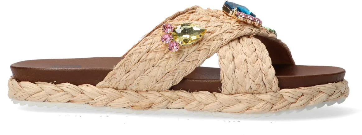 Het Spaanse merk BiBi Lou heeft een toffe collectie van trendy schoenen met een eigenwijze, vrouwelijke en krachtige uitstraling. Schoenen van dit merk zijn niet alleen heel mooi om te zien, maar je kunt er ook nog eens de hele dag op lopen zonder pijn te ervaren. Deze beige platformslipper 889Z70HG heeft dubbele banden van gevlochten materiaal met opvallende strass-stenen in verschillende vormen en kleuren. De gekruiste banden zijn zijn gevoerd met leer. Samen met het leren, licht voorgevormde voetbed met een gewatteerde vulling, zorgt dit model voor veel comfort. De loopzool is gemaakt van lichtgewicht microrubber en door het ribbelprofiel heb je een goede grip. De zool (inclusief voetbed) is zo'n 3 centimeter dik en aan de zijkant komt het vlechtwerk van de slipper weer terug. Een eigenwijze, stoere kandidaat om je outfit flink op te spicen! De banden vallen vrij smal, we raden je aan om een maat groter te bestellen!
