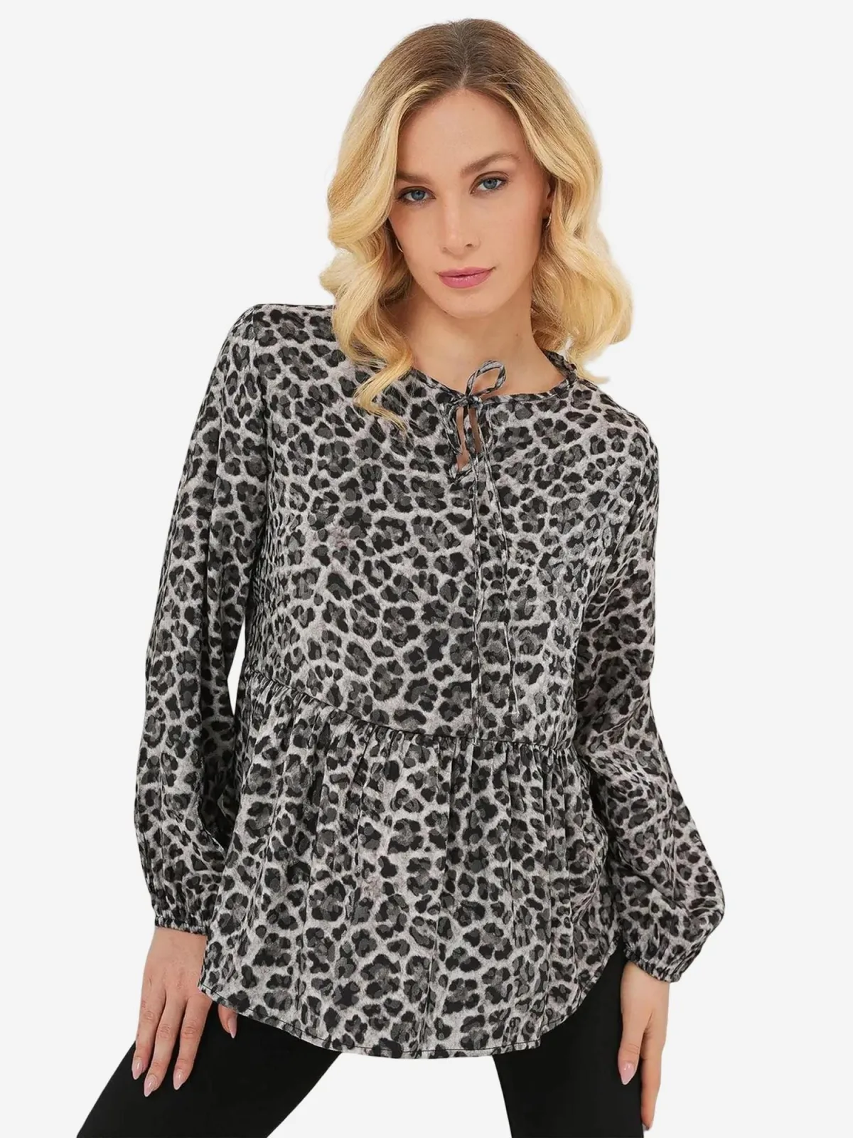 Blouse type: Wijde blouse; Design: Gevoerde zoom/rand; Materiaal: Viscose; Motief: Dierenprint; Kraag: Tuniek kraag; Details: Volant, Gedrapeerd; Extra's: Gladde stof; Pasvorm: Normale pasvorm; Armlengte: Lange mouw; Lengte: Normale lengte