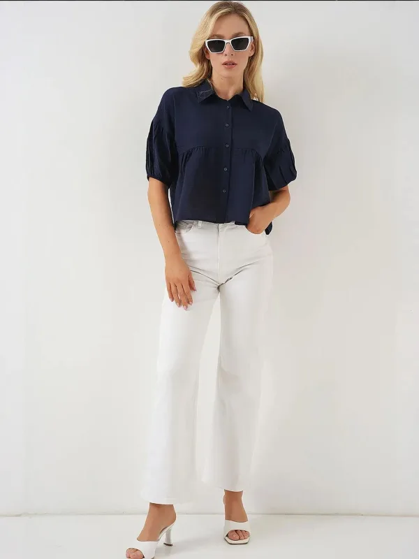 Blouse type: Klassieke blouse; Design: Rechte zoom, Knop placket; Type sluiting: Knoopsluiting; Materiaal: Viscose; Motief: Effen; Kraag: Kentkraag; Details: Gedrapeerd; Extra's: Op staal naden, Voelt zacht aan; Pasvorm: Losse pasvorm; Armlengte: Halve mouw; Lengte: Korte pasvorm