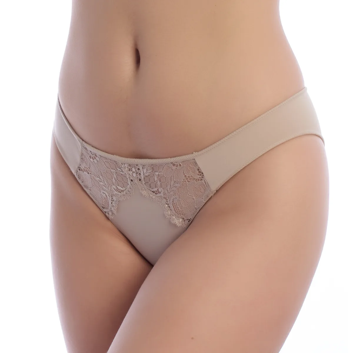 Bikinibroekje dat comfort en modern design combineert, perfect voor dagelijks gebruik of voor wie op zoek is naar een functioneel kledingstuk met stijl. Details: - Bikinislip met matige bedekking. - Decoratief kant aan de voorkant. - Gladde achterkant. - Zachte, elastische tailleband. - Minimalistisch ontwerp. - Elegante kleuren. - Elastisch en zacht materiaal. Een veelzijdig en comfortabel kledingstuk dat geschikt is voor elke gelegenheid en een perfecte balans biedt tussen eenvoud en elegantie. Samenstelling: 74% Polyamide, 15% Elastaan, 11% Katoen Onderhoud: - Handwas. - Niet centrifugeren.