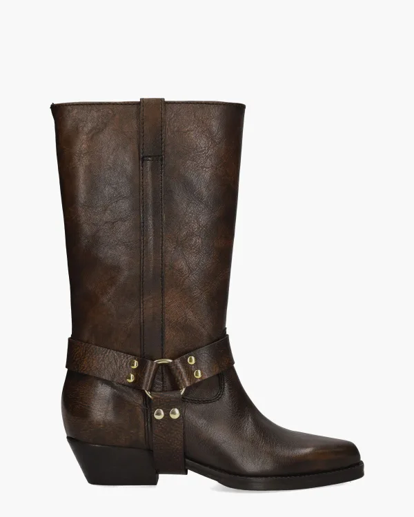 Handgemaakte lange laarzen voor dames, model A7165 van Billi Bi. Deze motorstyle laarzen met een vleugje Western zijn gemaakt van washed leer in een mix van zwart en bruin waardoor de boots een robuuste uitstraling krijgen. De binnenkant combineert leer en stof met een superzacht vast voetbed. Met opvallende banden, gouden ringen en studs