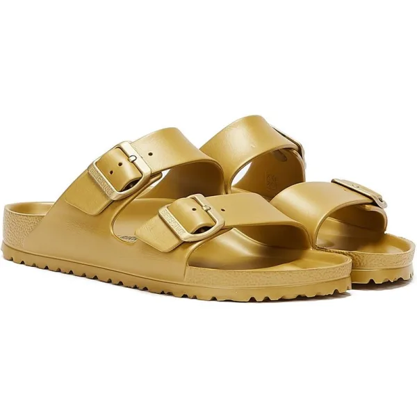 De Birkenstock Arizona EVA in een sprankelende Glamour Gold is de ultieme combinatie van stijl en functionaliteit. Deze smalle slipper met verkort smal voetbed zit als gegoten en biedt dankzij het compacte ontwerp een nauwsluitende, veilige pasvorm. De slipper is gemaakt van volledig EVA‑materiaal, waardoor hij ultralicht, waterbestendig en onderhoudsvriendelijk is. Met de iconische tweebandconstructie en verstelbare gespen pas je de fit eenvoudig aan voor optimaal draagcomfort. Het anatomisch gevormde EVA-voetbed zorgt voor uitstekende schokdemping en voetsteun.