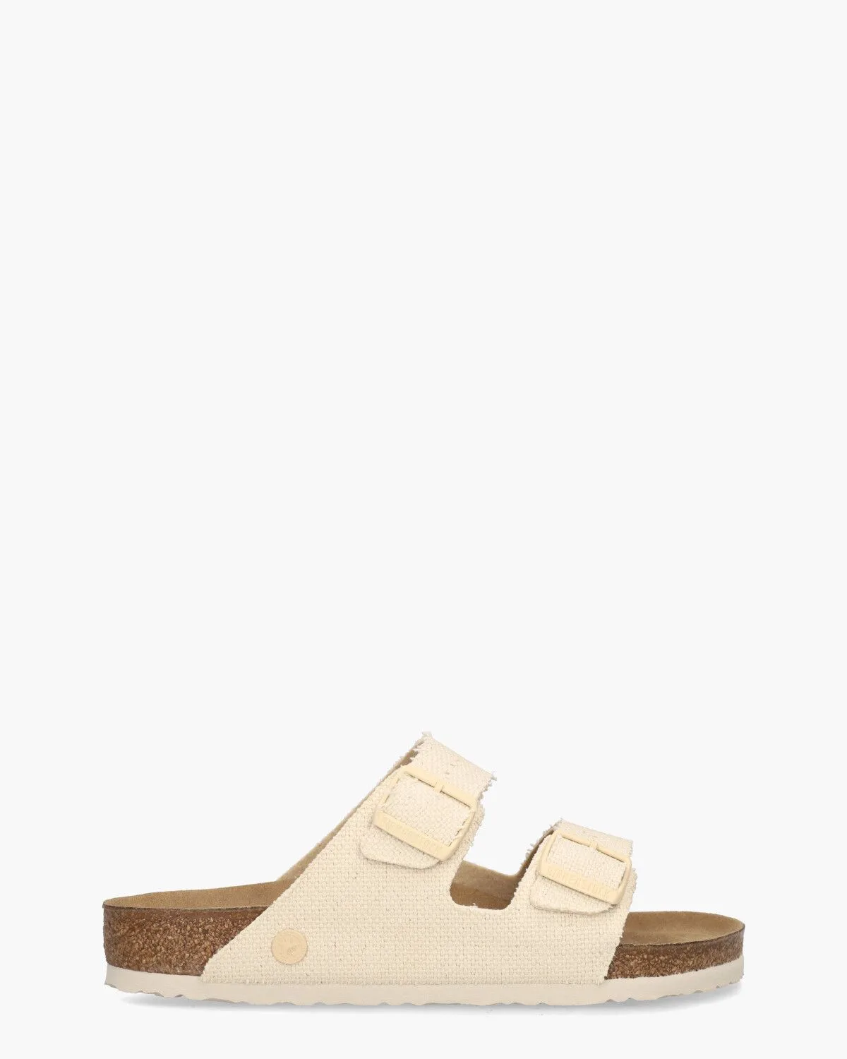 Slippers voor dames Arizona Rivet Logo 1026674 uit de collectie van Birkenstock. Deze slides hebben een upper van canvas in een gebroken witte tint. Het speciale microvezel soft-voetbed is voorgevormd en zorgt voor extra comfort tijdens het lopen. De twee wreefbanden met ton-sur-ton logo-gespen zijn verstelbaar. Een EVA-zool en branding aan