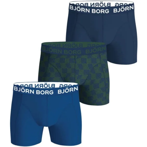 Björn Borg 3-Pack Boxershorts – Cotton Stretch Comfort voor elke dag dankzij zachte katoen-stretch, een aansluitende fit en de iconische logoband. Deze set combineert twee effen blauwtinten met een speelse print voor variatie in je lade. Belangrijkste kenmerken * Set van 3 stuks – elke dag fris en comfortabel * Katoen-stretch: 95% katoen / 5% elastaan (ademend & flexibel) * Zachte, vormvaste logoband * Middenlange pijp – blijft goed op z’n plek * Ideaal voor dagelijks gebruik en sport Kleuren in deze 3-pack * 1× Donkerblauw (navy) – met witte Björn Borg logoband * 1× Helder/kobaltblauw – met witte Björn Borg logoband * 1× Donkergroen met geometrische all-over print – met ton-sur-ton groene band Onderhoudsinstructies * Machinewas 40 °C, bij voorkeur binnenstebuiten * Met gelijke kleuren wassen * Niet in de droger, niet bleken * Niet heet strijken op de band Artikelnummer 10004588-MP003